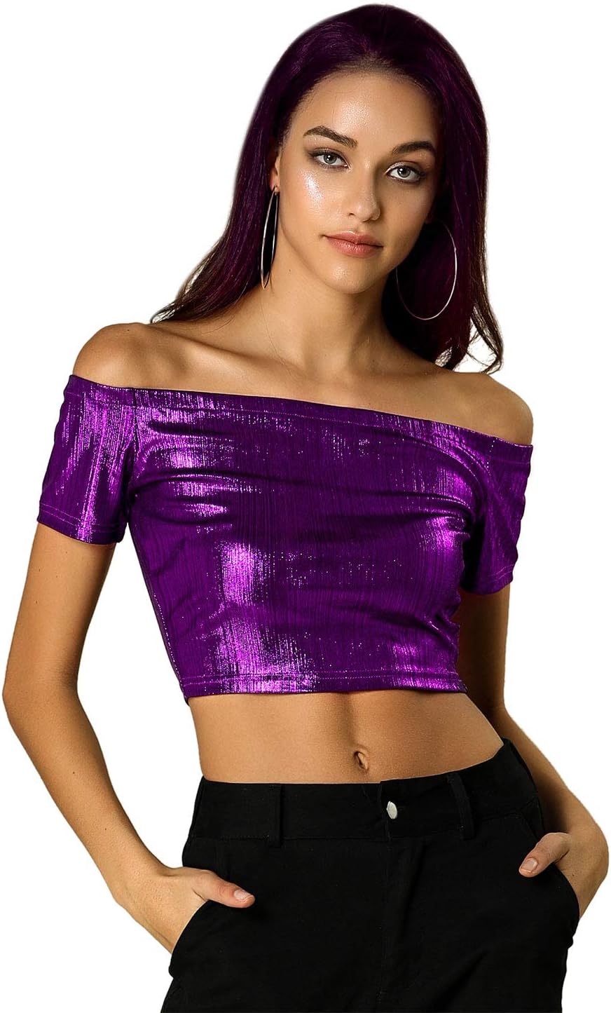 Allegra K Women's Halloween Off Shoulder Party Club Slim Fit Shiny Metallic Crop Top