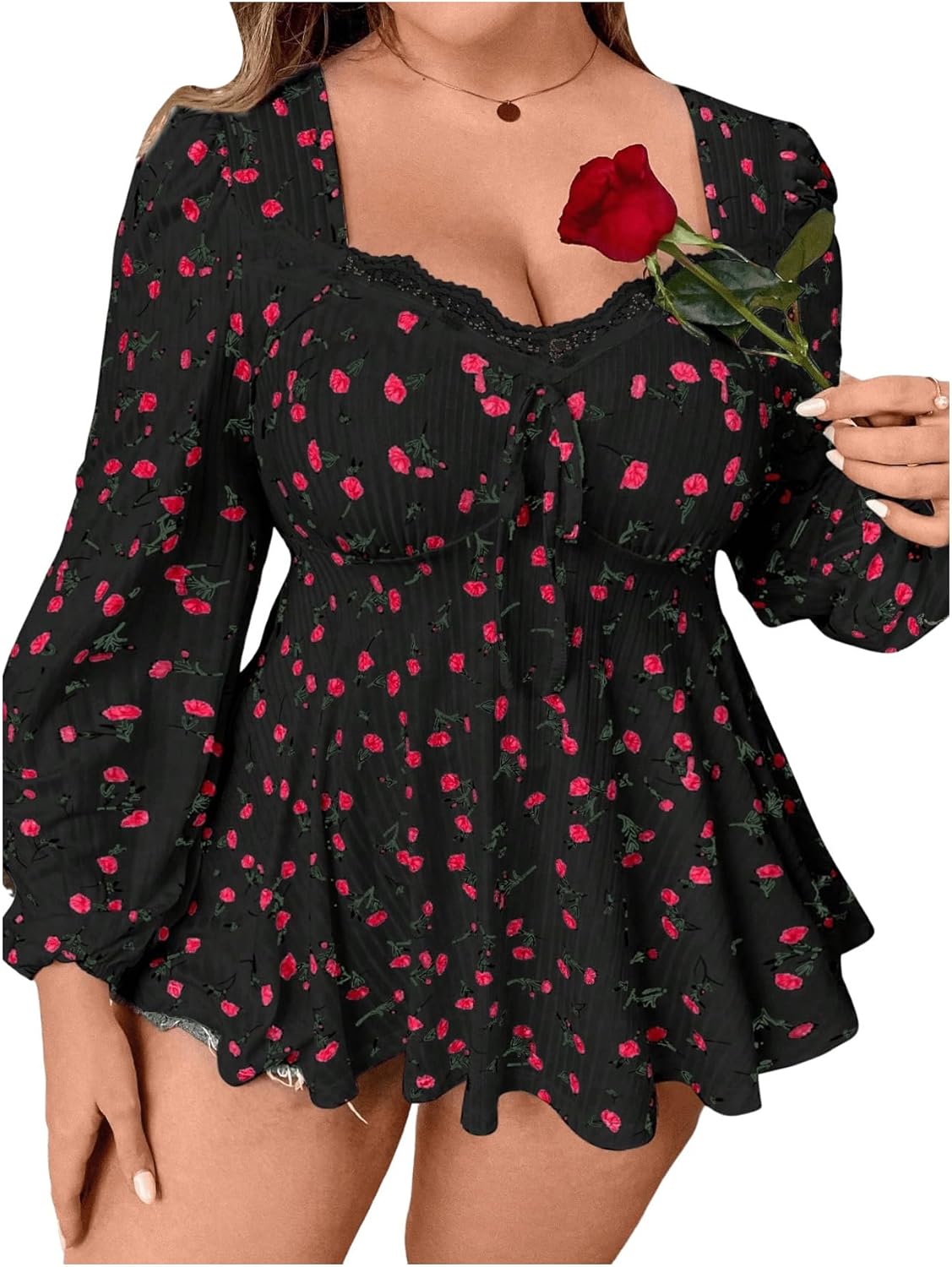 SOLY HUX Women's Plus Size T Shirt Floral Print Lace Trim Bishop Long Sleeve Ruffle Hem Tee Tops