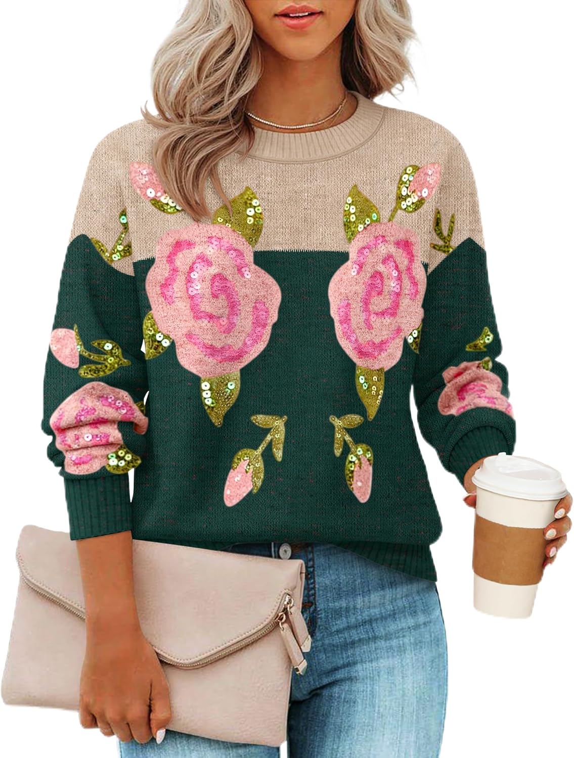 ZESICA Women's Floral Oversized Sweaters 2026 Fall Crewneck Long Sleeve Casual Chunky Knit Pullover Sweater Tops