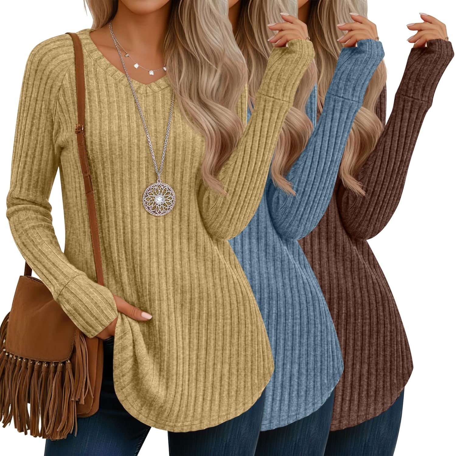 3 Pack Women's V Neck Sweaters with Thumb Holes Ribbed Long Sleeve Shirts Casual Fall Tops Tunic Clothes