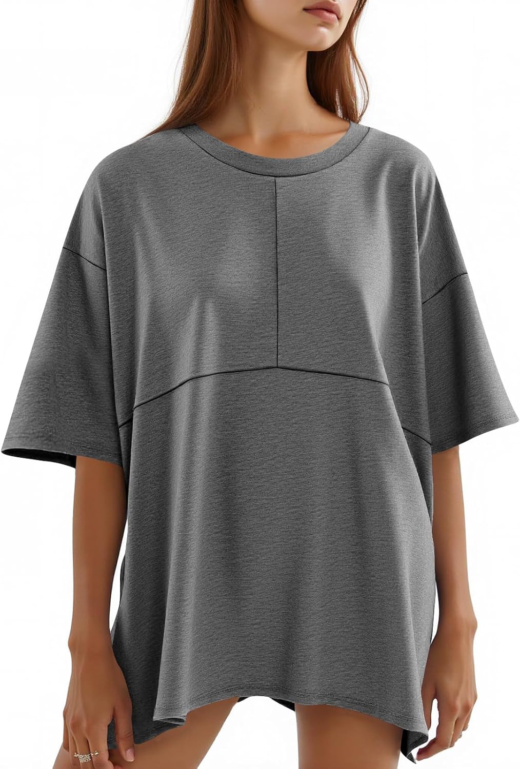 Tankaneo Womens Oversized Crewneck Shirts Short Sleeve Off The Shoulders Tops Curved Hem Tshirt
