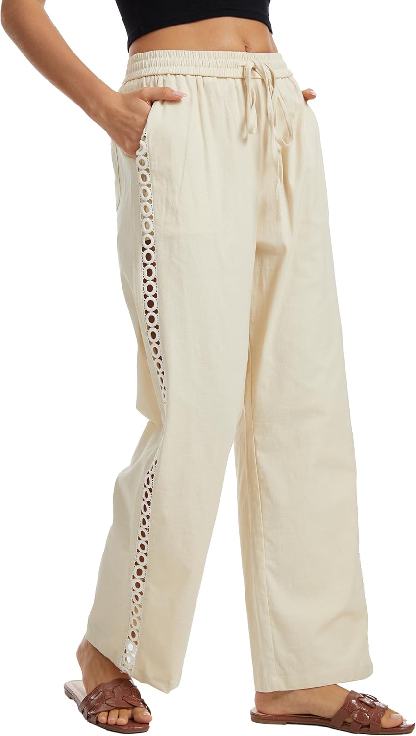 Demoking Womens Linen Pants Wide Leg Casual Palazzo Drawstring Loose Cotton Beach Vacation Clothes for Women with Hollow Side