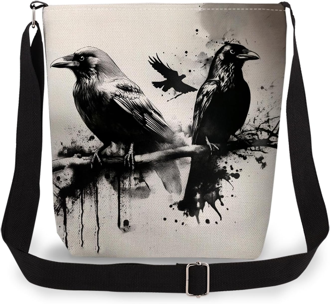 Ink Crow Print Canvas Crossbody Bag, Adjustable Strap Lightweight Purse with Top Zipper & Inner Pocket, Daily Shoulder Bag Gift for Women -5