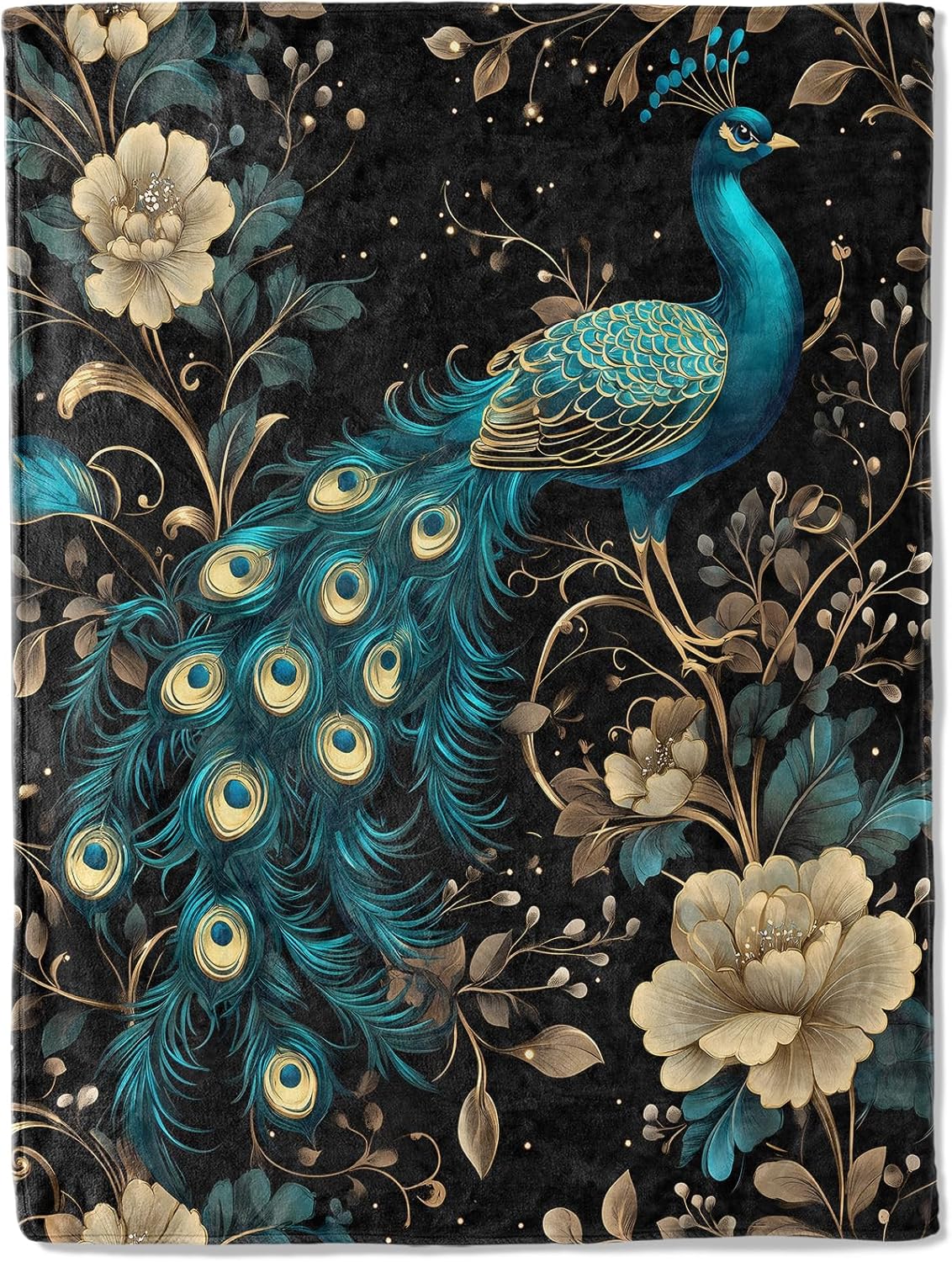 Elegant Peacock Flannel Blanket - Luxurious Floral with Majestic Bird and Golden Flower Throw - Soft Cozy Gifts Blankets for Kids Women & Nature Lovers, Country Decor, Artistic Accent 50x60in