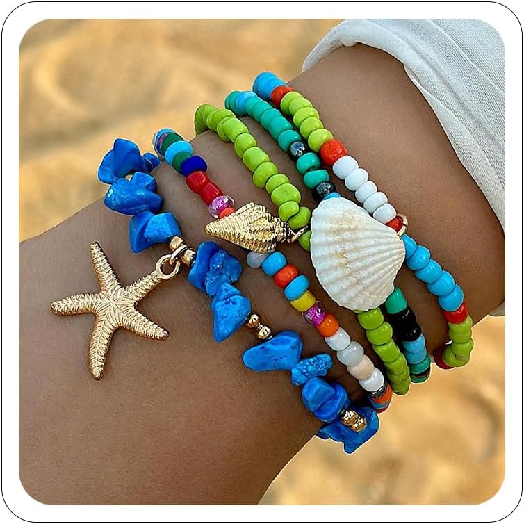 Shell Bracelet Boho Beaded Layered Starfish Bracelets Seashell Stretch Bead Bracelets Conch Summer Beach Devil's Eye Charm Bracelets Stack Jewelry for Women