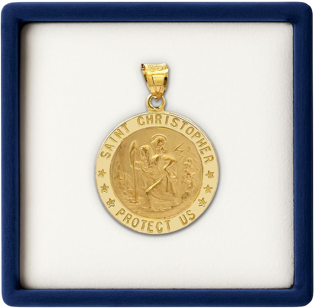CROSS + CROWN Premium 14K Yellow Gold, Durable Double-Bonded Pendant for Necklace, Women & Mens Gold St Christopher Medal & Premium Jewelry Box, Handcrafted Religious Jewelry in the USA