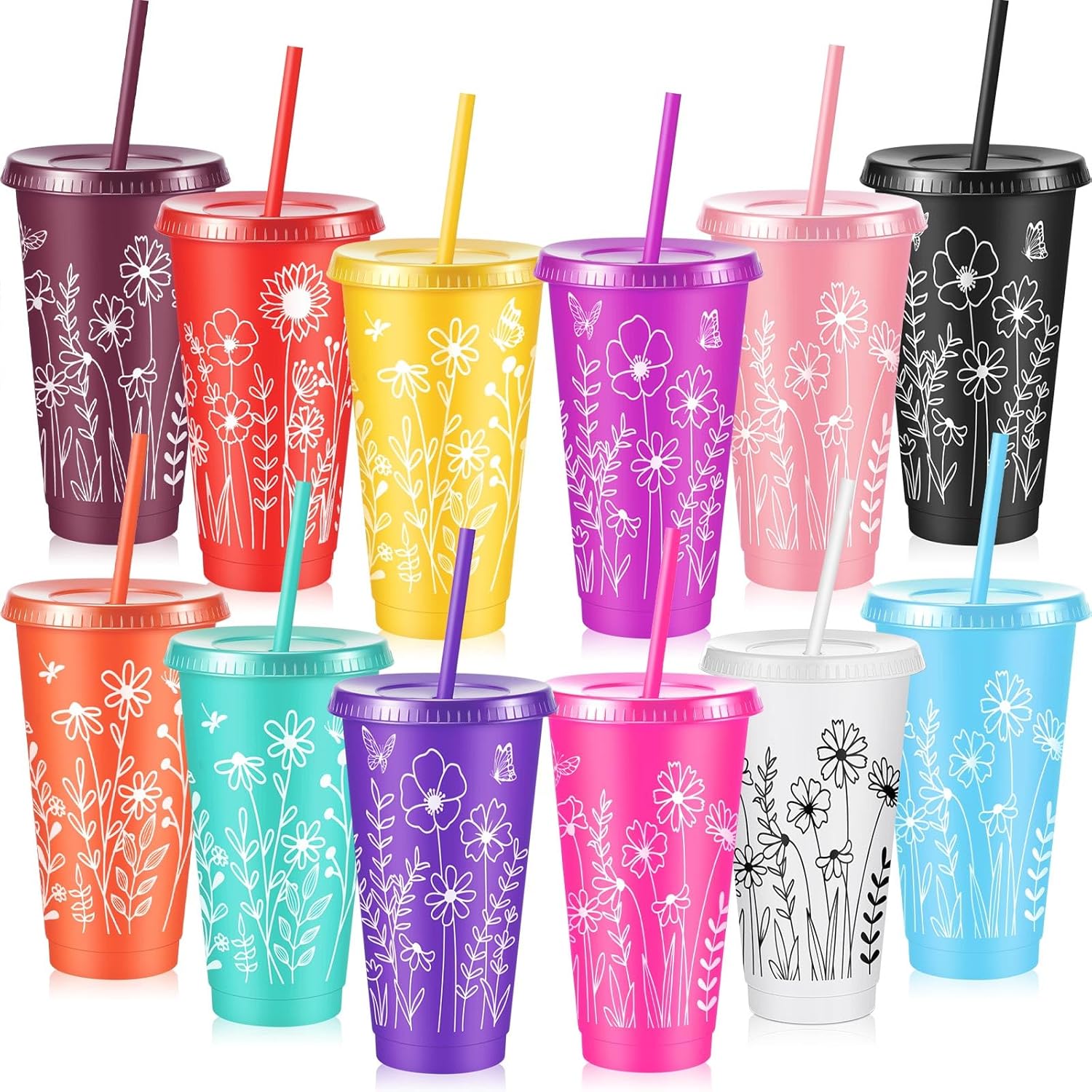 - Bulk Wildflower tumblers: embrace a unique style with 12 pieces of 24 oz floral plastic cups with lids and straws, offering 12 distinct wildflower designs; It's a notable assortment that captivates the eye and services your daily beverage needs