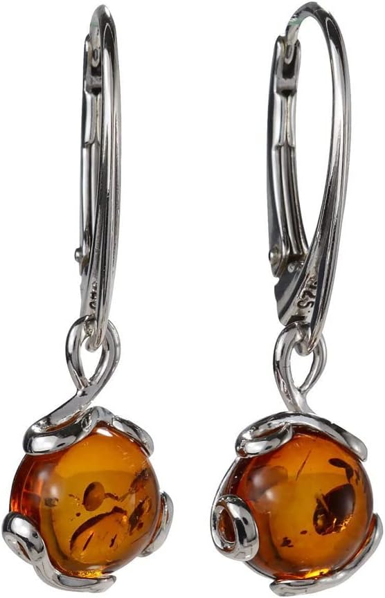 Amber Dangle Earrings for Women – Genuine Baltic Honey Amber Jewelry in 925 Sterling Silver, Round Leverback Earrings