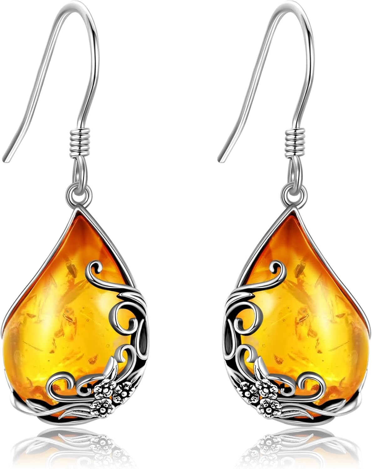 POPLYKE Lotus Hummingbird Bee Earrings 925 Sterling Silver Teardrop Moonstone Amber Onyx Lapis Lazuli Larimar Rose Quartz Moss Agate Dangle Earrings for Women Gemstone Jewelry