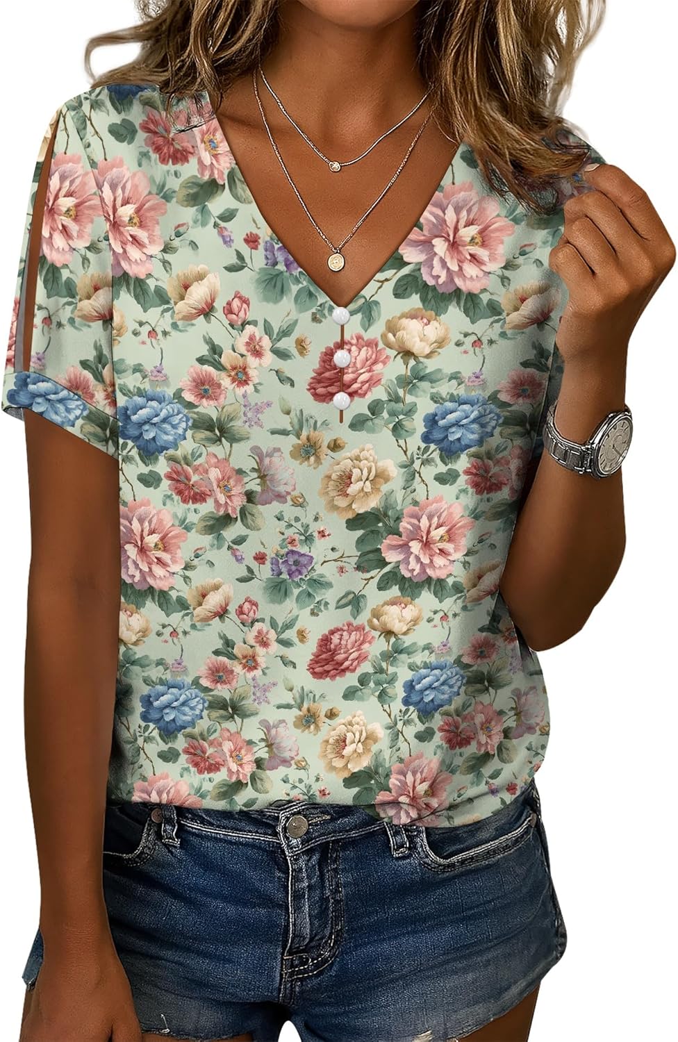 Cold Shoulder Casual Tops for Women Button Boho Floral Printed V-Neck Vintage Short Sleeve Summer T Shirts