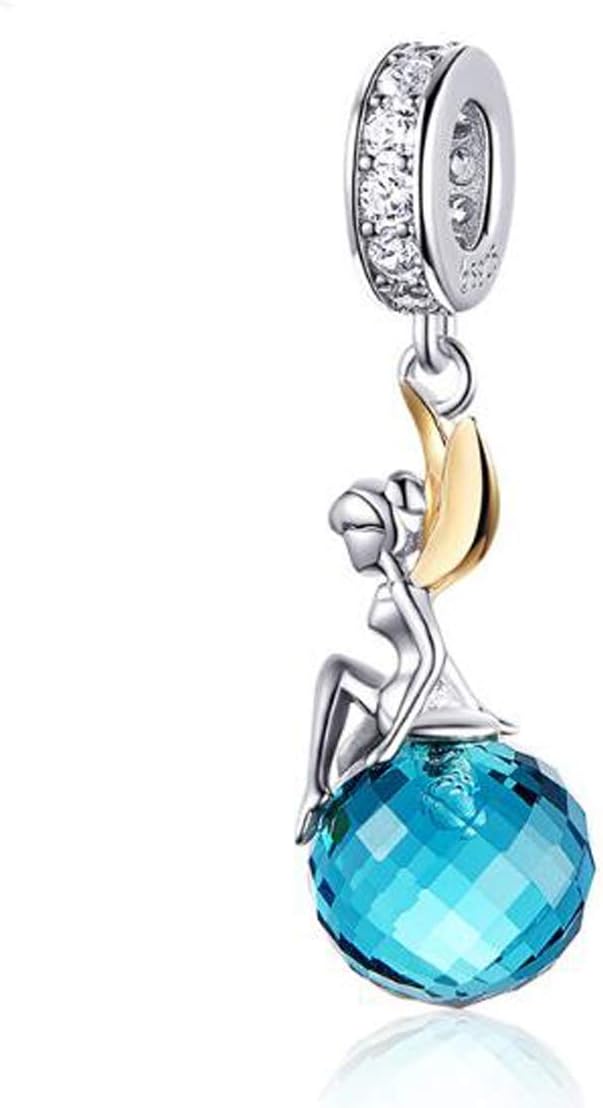 Fairy Charm 925 Sterling Silver Feathers Wing Angel Charms Blue Birthstone Charms for Bracelets Charm Bracelet Bead for Women (Blue Crystal Angel Girl)