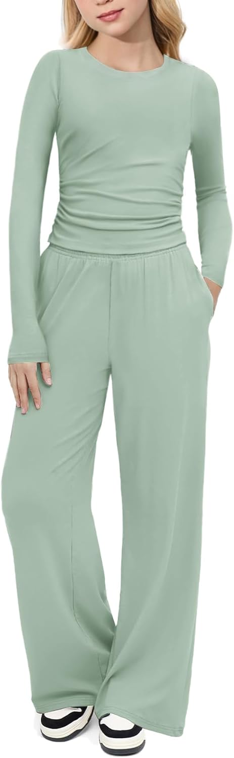 Arshiner Girls 2 Piece Set Fall Outfits Lounge Sets Ruched Long Sleeve Top Wide Leg Pants Sweatsuit Clothing Set
