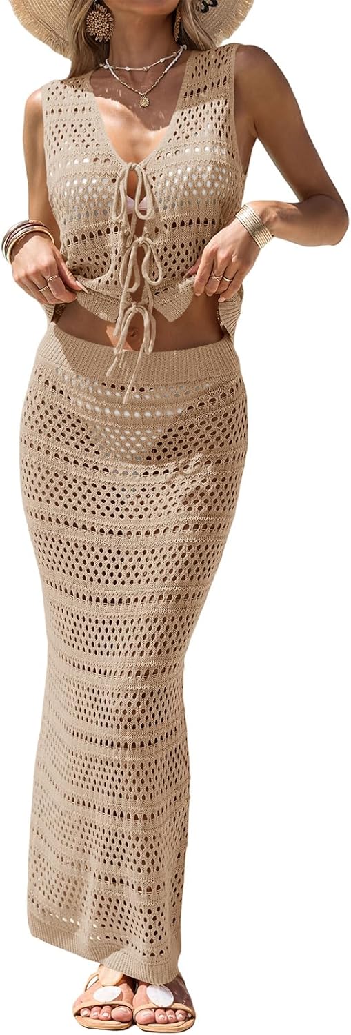 Fisoew Womens Crochet Cover Up 2 Piece Skirt Sets Sleeveless Crop Cardigan Tank Tops Swim Coverup Set