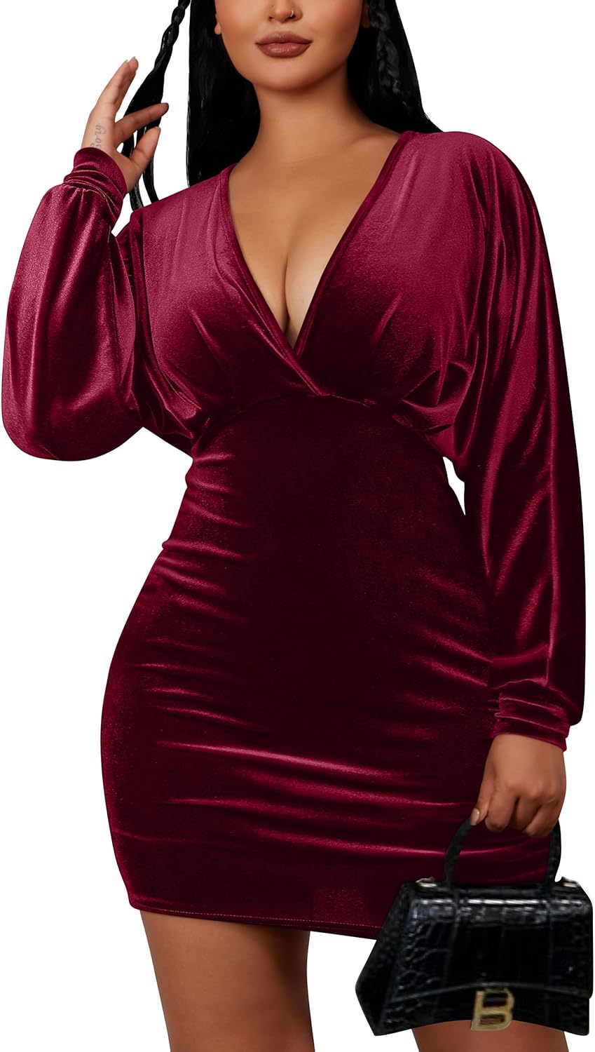 YMDUCH Women's Elegant Deep V Neck Long Sleeve Batwing Bodycon Velvet Mini Party Club Dress