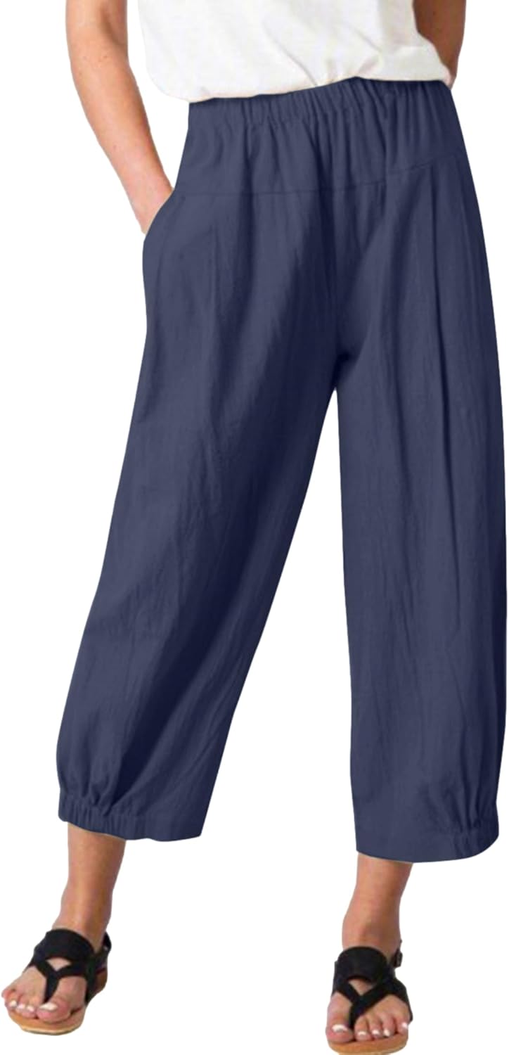 Women's Summer Linen Yoga Pants Wide Leg Capris Cropped Pants with Pockets Lounge Casual