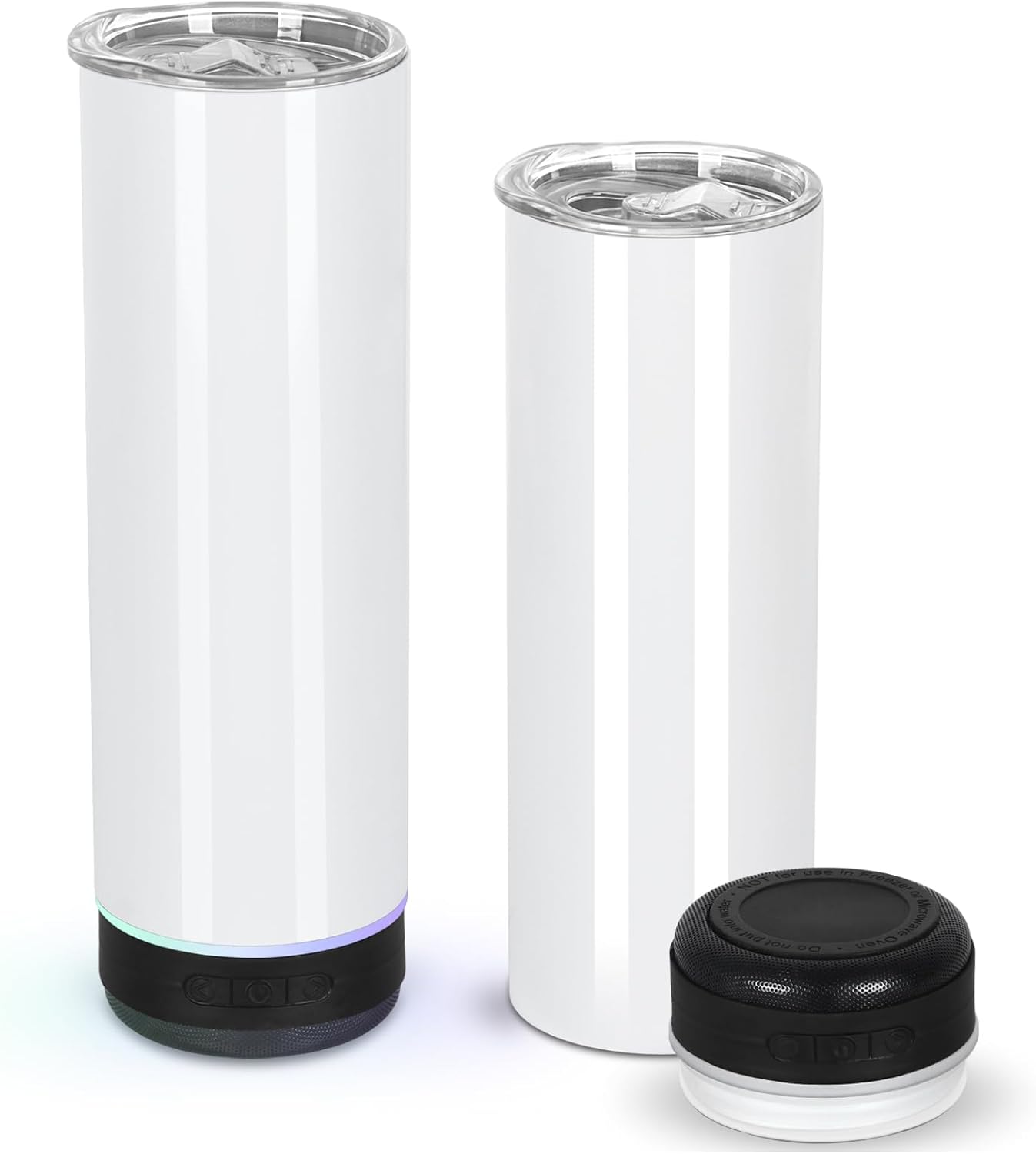 - Package Includes: This sublimation music speaker tumbler package includes: 2 * Music Speaker Tumbler, 2 * Sliding Lid, 2 * USB charging cable, 2 * Straw and Straw Brush, 2 * Sublimation shrink wrap, 2 * White Inner Box, 1 x Outer Box.