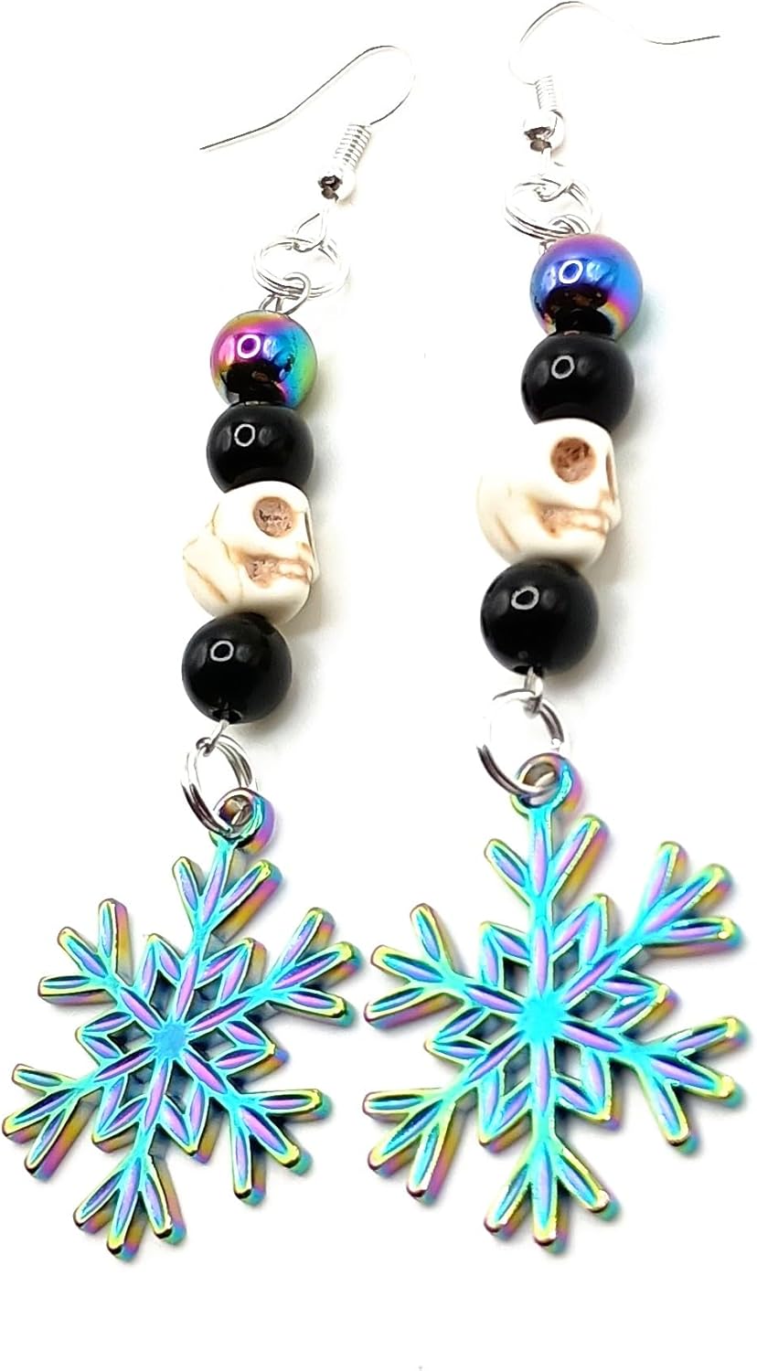 Handmade Dangle Earrings (Beaded Purple Snowflake Charm Rainbow Hematite & Skull Howlite)