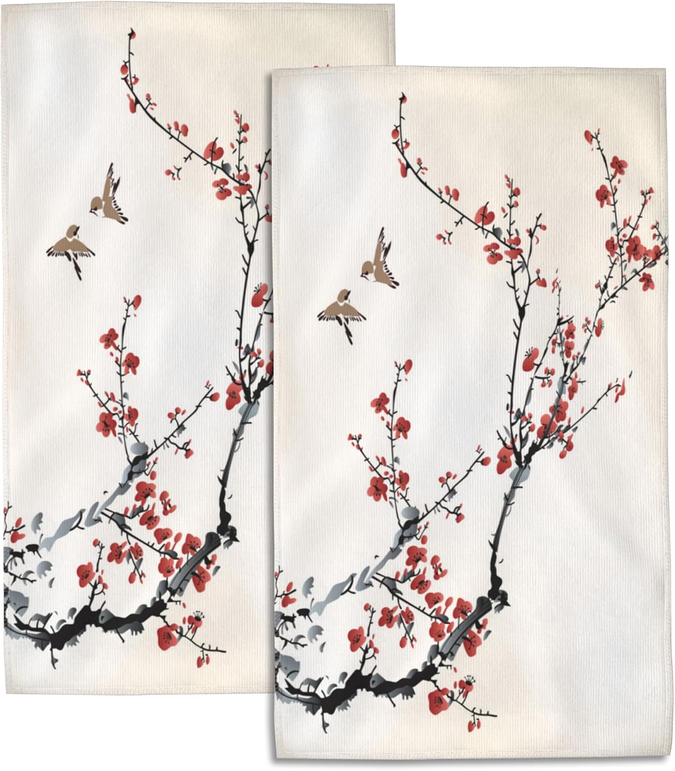 Red Plum Bath Hand Towels Set of 2, Watercolor Birds and Red Plum Blossom Decorative Bath Towels Soft Super Absorbent Hand Towels for Bathroom Hotel Gym Home Decor,14"X28"