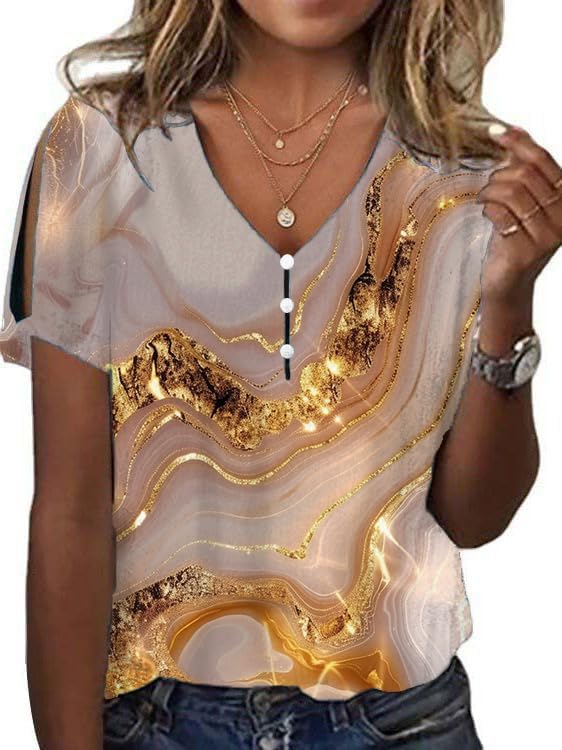 Cold Shoulder Tops for Women 2024 Marble Printing V Neck Fashion Novelty Fit Camping Tee Off The Shoulder Tops for Women