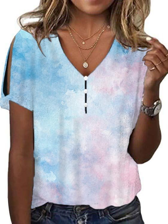 Cold Shoulder Tops for Women 2024 Marble Printing V Neck Fashion Novelty Fit Camping Tee Off The Shoulder Tops for Women