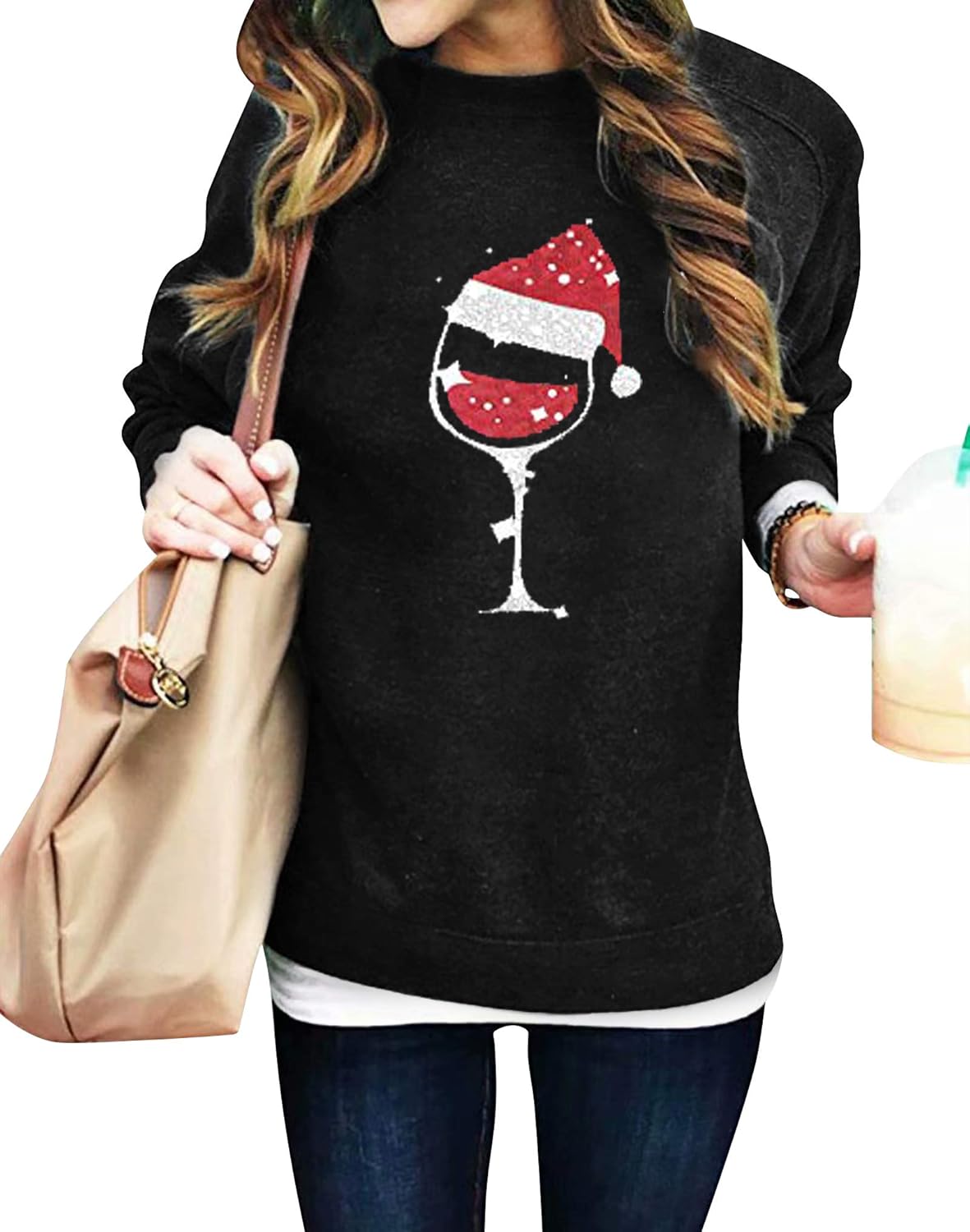 SUPEYA Women Red Wine Glass Christmas Sweatshirt Funny Christmas Pullover Xmas Santa Hat Graphic Blouse Tshirt Tops