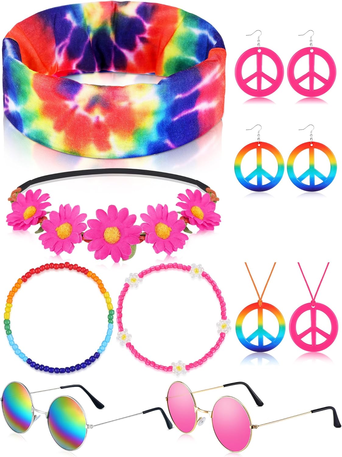 Tudomro 10 Pcs Halloween Hippie Costume Accessories Hippie Sunglasses Bracelet Earrings Necklace Tie Dye Headband for 60s 70s