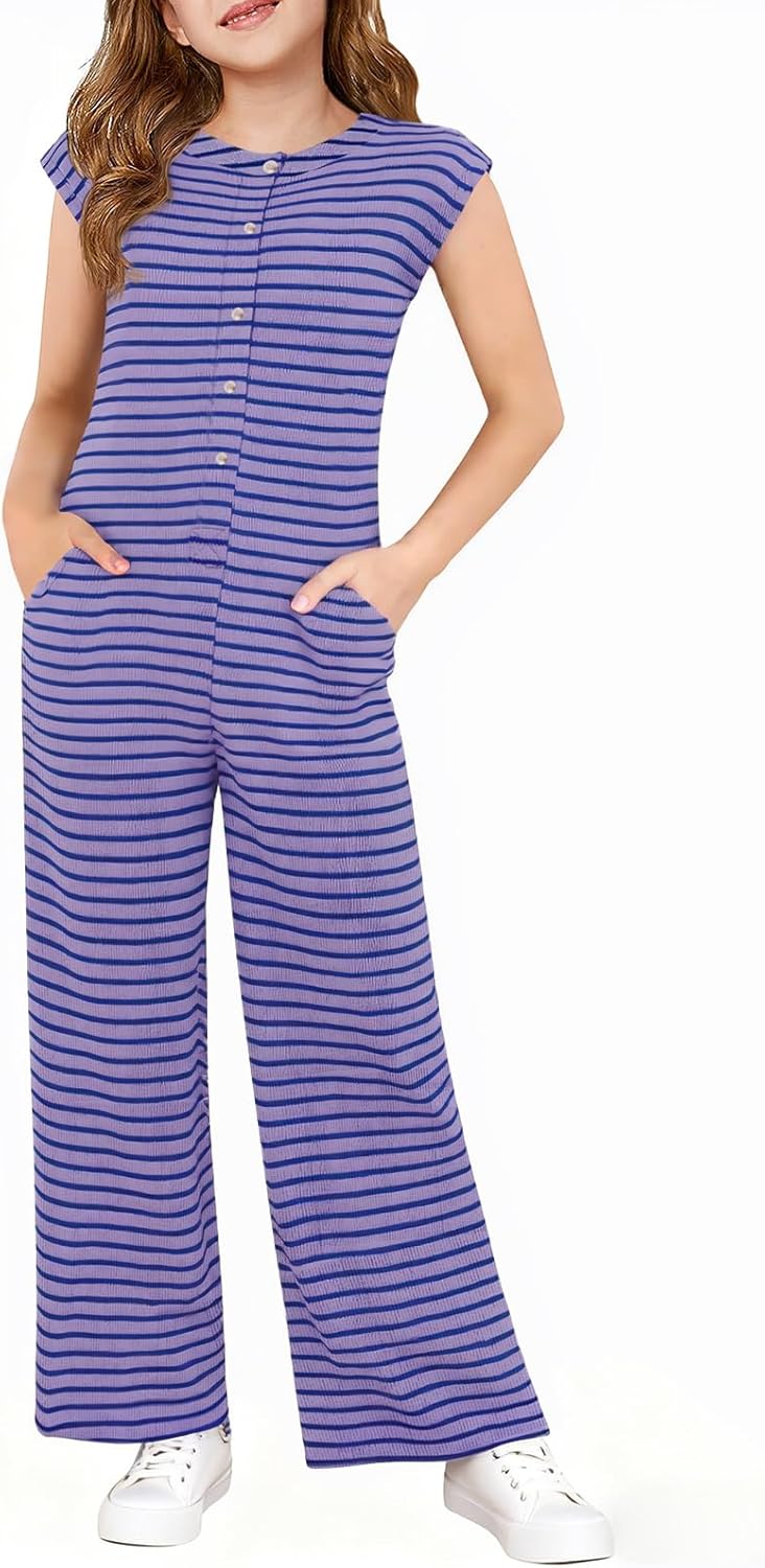 Haloumoning Girls Striped Jumpsuit Kids Summer Cap Sleeve Wide Leg Romper Button Down Outfits 5-14 Years