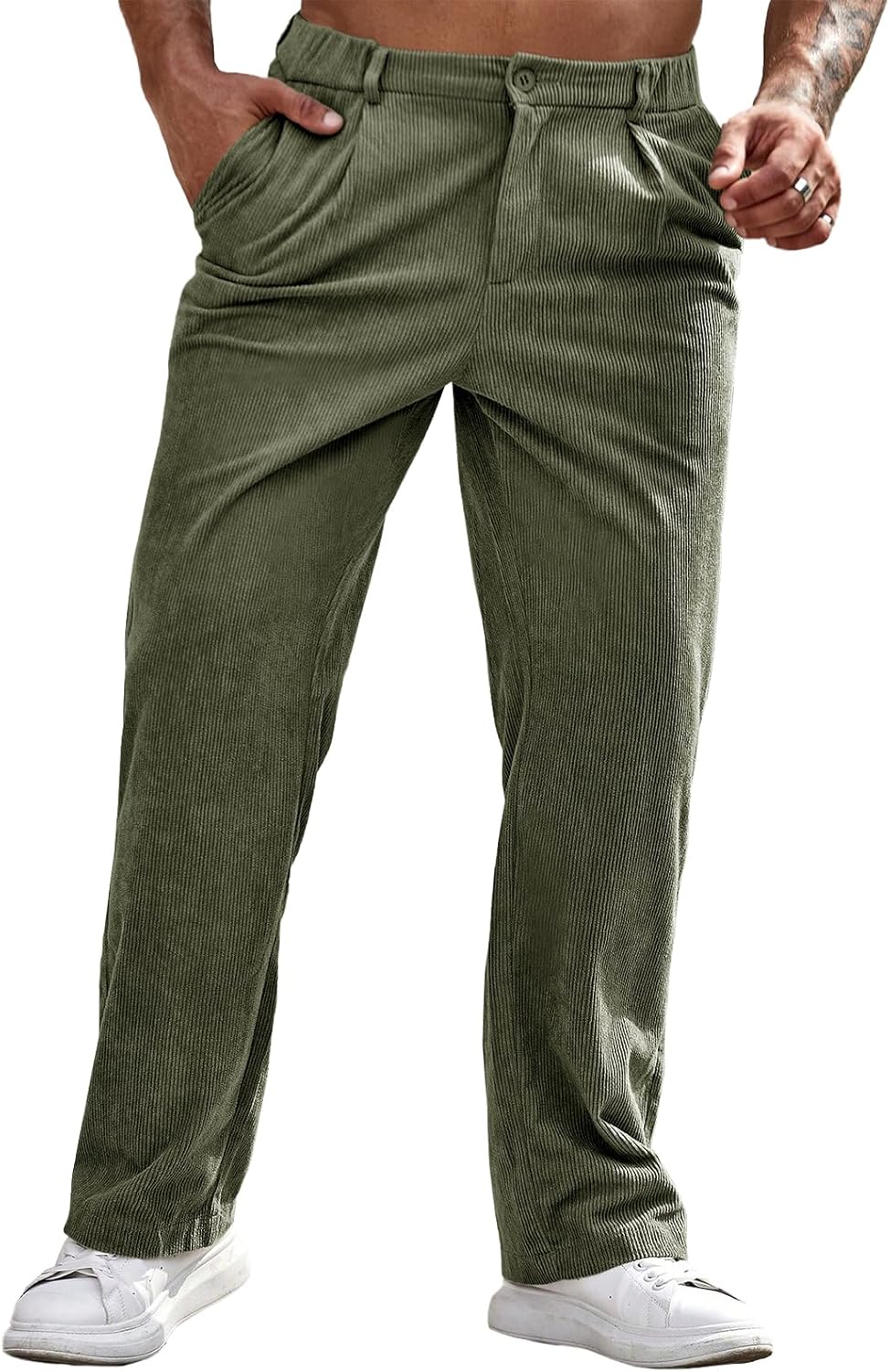 Runcati Mens Corduroy Pants Elastic Waist Straight Leg Casual Pleated Pants with Pockets