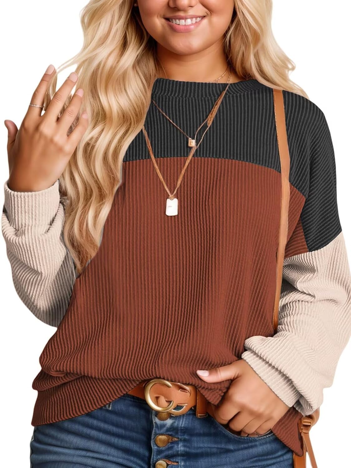 DOLNINE Plus-Size-Tops-for-Women Fall Casual Long Sleeve Shirts Oversized Color Block Crewneck Sweatshirts Ribbed Knit Tunic