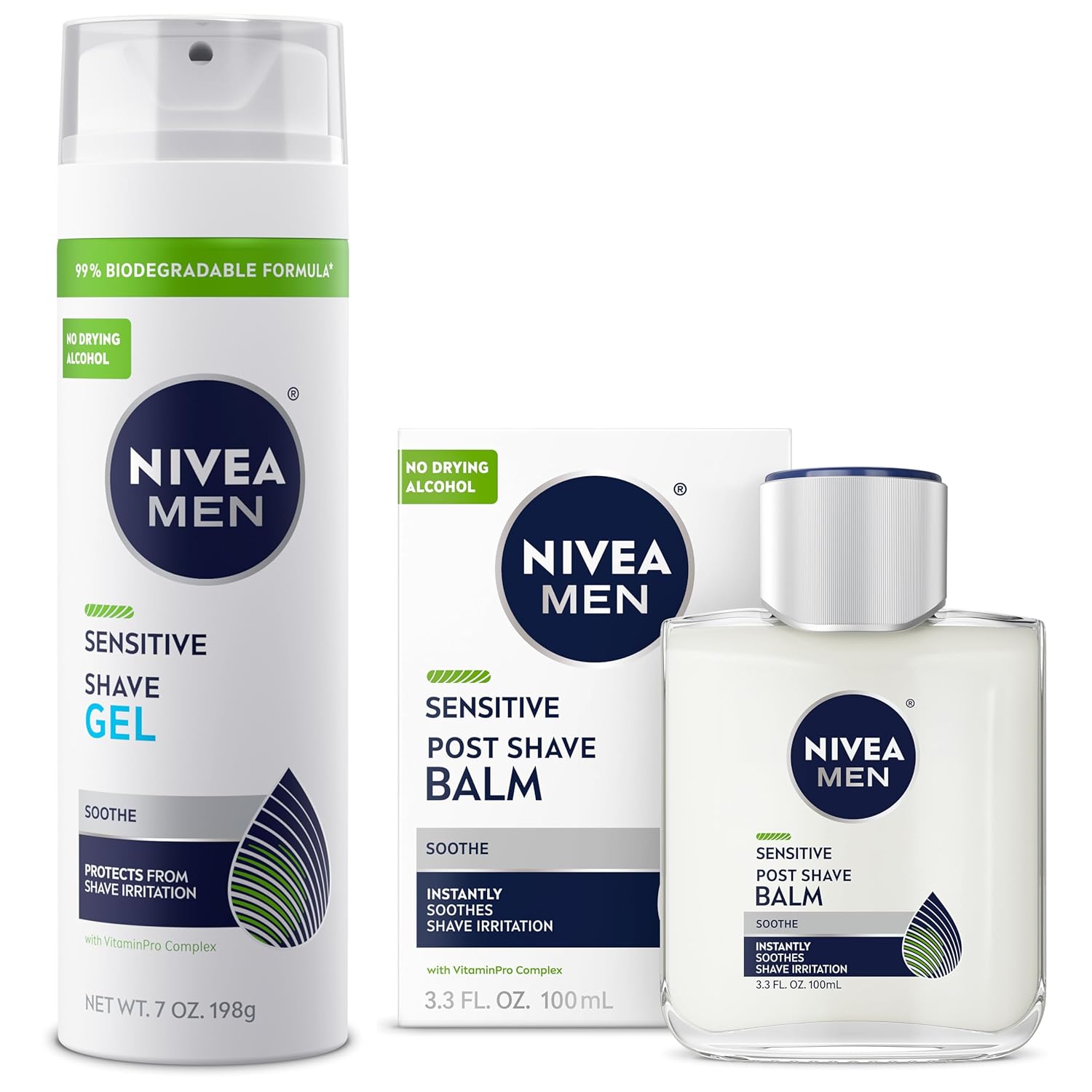 - SHAVING SET FOR MEN INCLUDES: One (1) 7 ounce can of NIVEA MEN Sensitive Shave Gel and one (1) 3.3 fluid ounce bottle of NIVEA MEN Sensitive Soothing Post Shave Balm