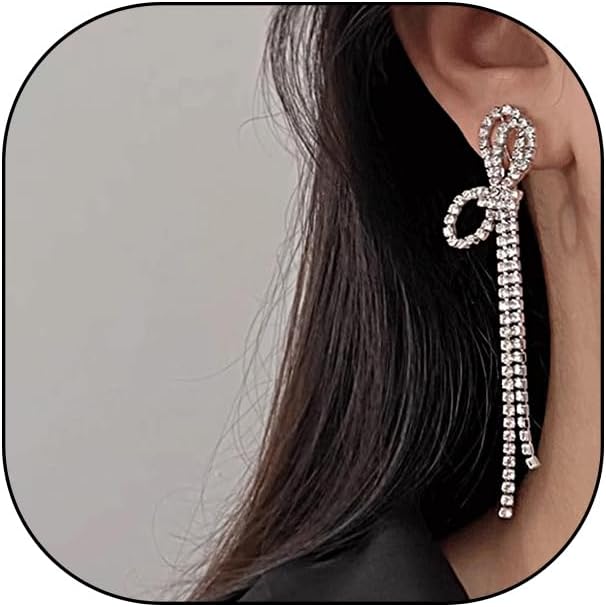 Long Rhinestone Bow Tassel Earrings for Women Sparkling Crystal Ribbon Bowknot Linear Dangle Earrings Minimalist Bow Dangling Earrings Prom Jewelry