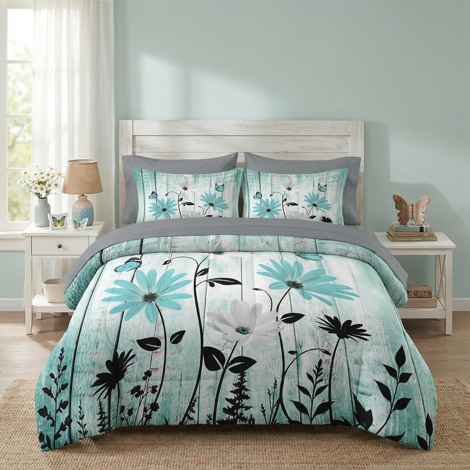 Nesker Comforter Set Queen Size, Turquoise Teal Daisy 7 Pcs Bedding for Kids and Adults, Botanical Floral Modern Bed Sheet Sets with Fitted Sheet 2 Pillowcases & 2 Shams