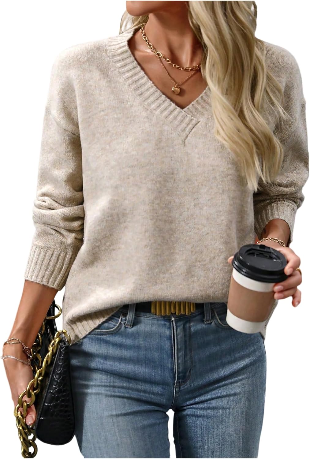 Women's V Neck Dressy Casual Sweaters Fall Long Sleeve Loose Knit Work Pullover Tops