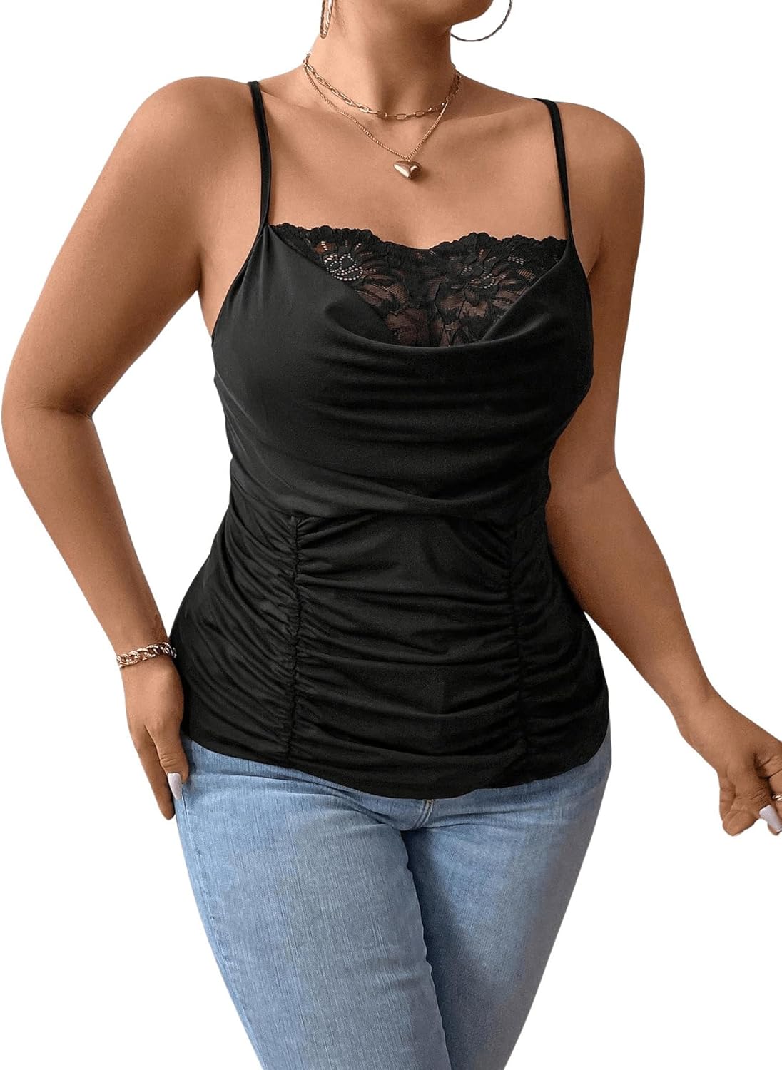 SOLY HUX Women's Plus Size Lace Trim Ruched Cami Tops Spaghetti Strap Draped Front Camisole
