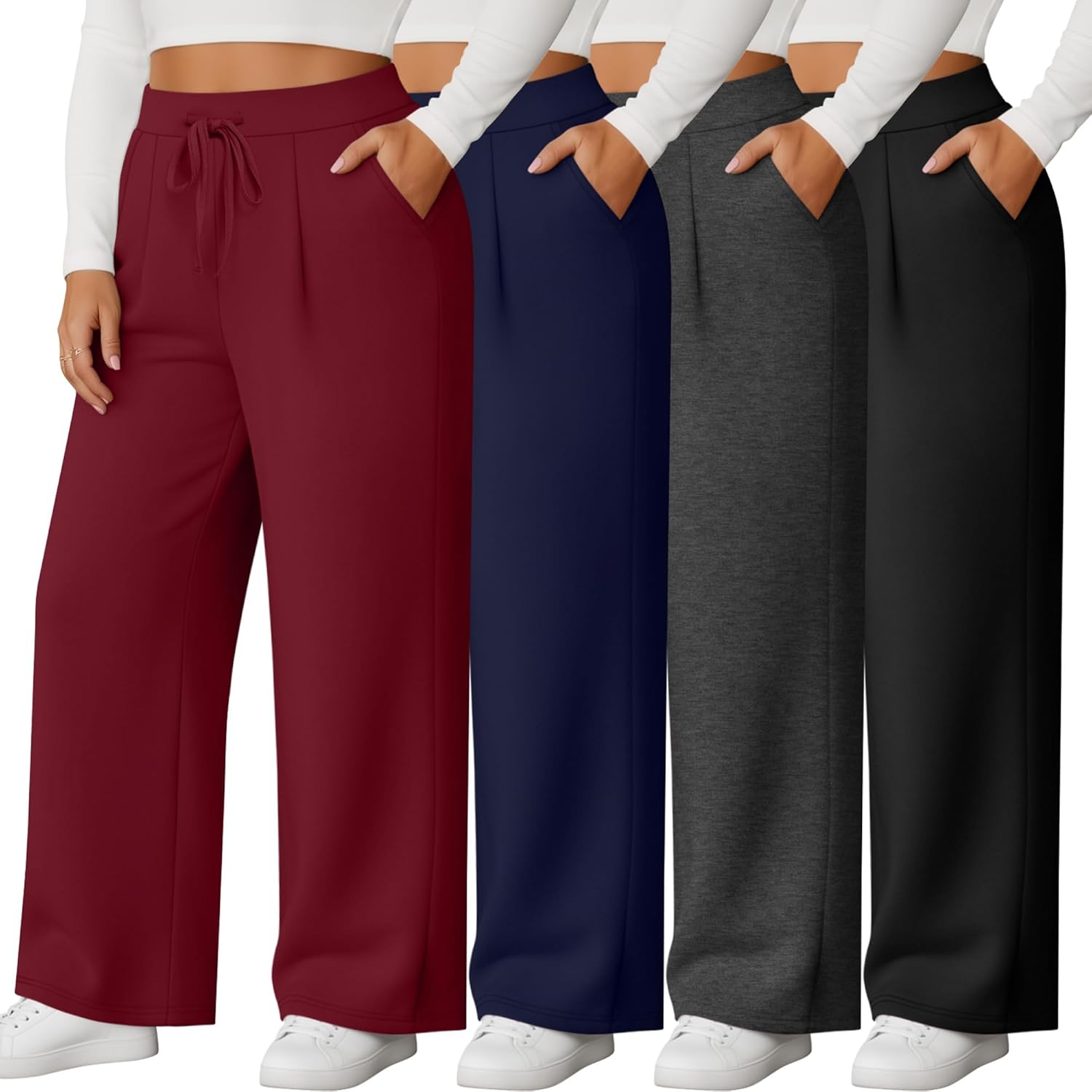 4 Pack Women's Plus Size Pants, Wide Leg Lounge Pants Drawstring Yoga Sweatpants Casual Workout Joggers with Pockets