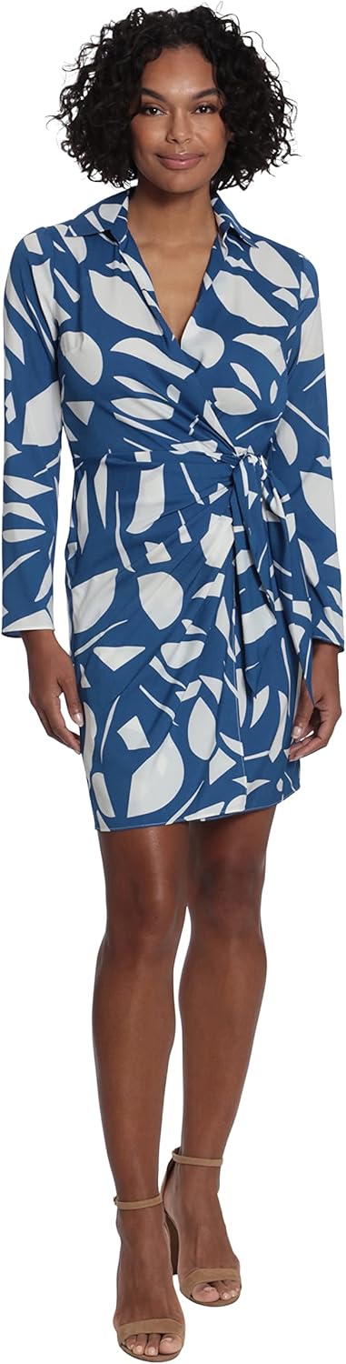 London Times Womens Geo Printed, Above The Knee Faux Wrap Dress with Tie and Collar
