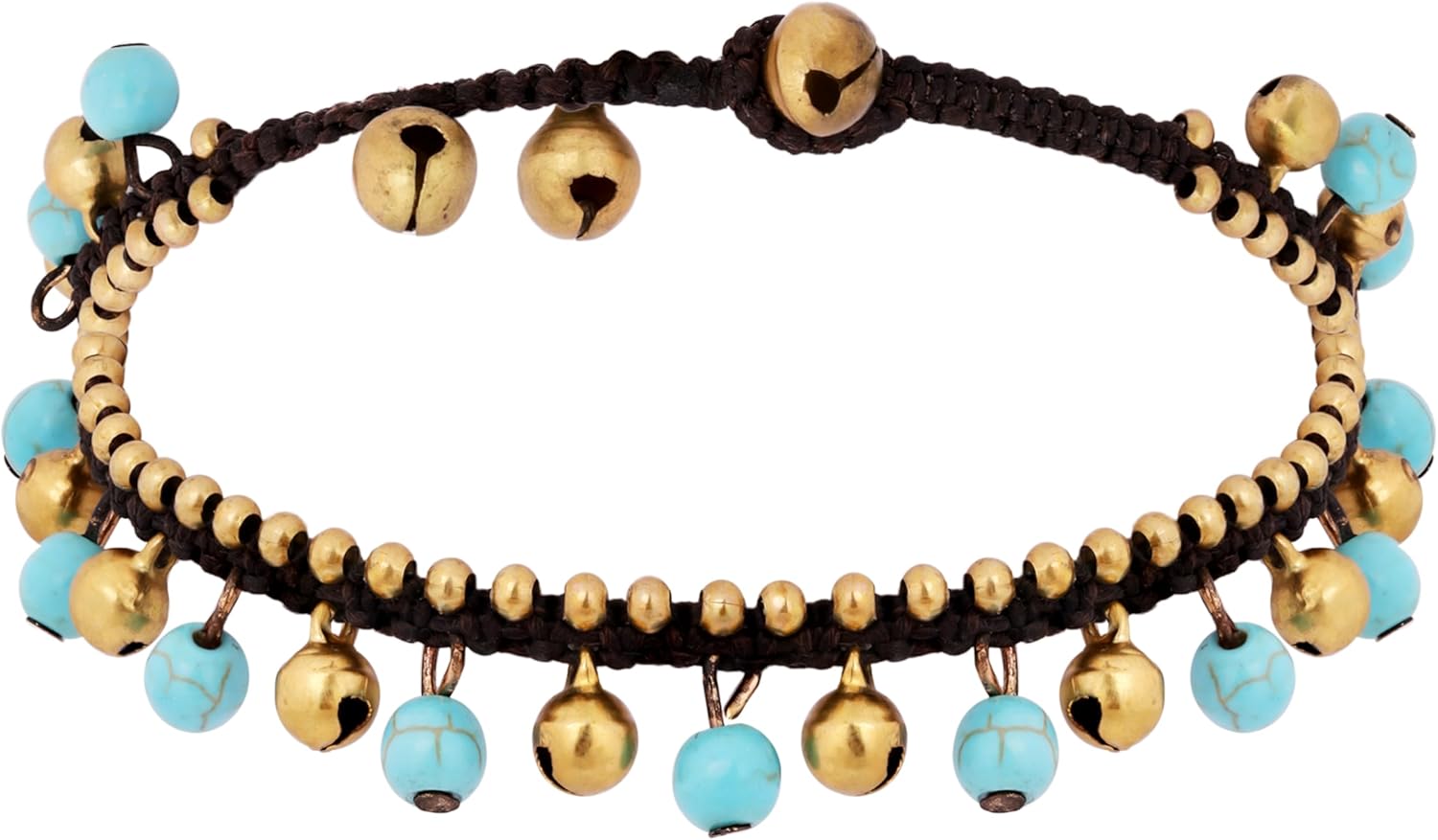 MINACHI Bohemian Style Anklet with Jingling Bell and Hand-woven Rope, Turquoise-toned and Brass Chain Foot Bracelet, Summer Beach Ankle Bracelet for Women