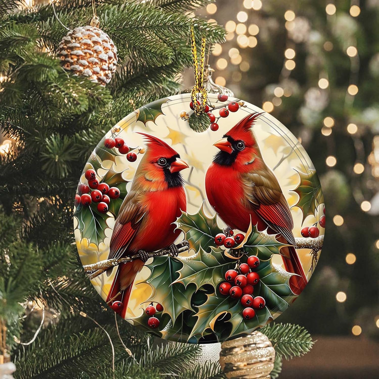 Cardinal Red Berry Ornaments Round Ceramic Hanging Ornament Christmas Keepsake Decor for Xmas Tree Winter Holiday Xmas Gift for Women Men 3"
