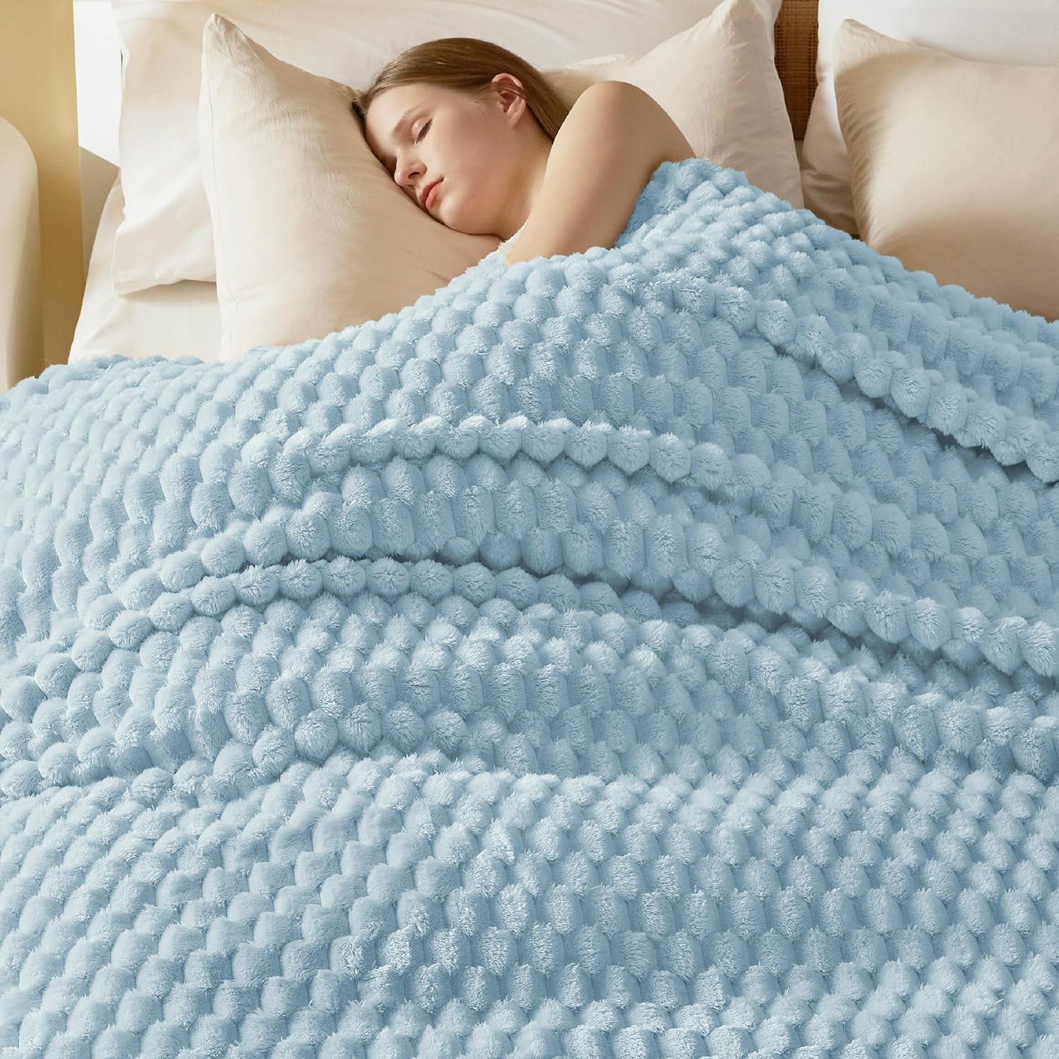 Bedsure Blanket Queen Size for Bed - 350GSM Fluffy Plush Bubble Blanket Queen Size for Home Room Decor, GentleSoft Cute Fleece Soft Cozy Gifts for Women Girls, Light Blue, 90x90 Inches