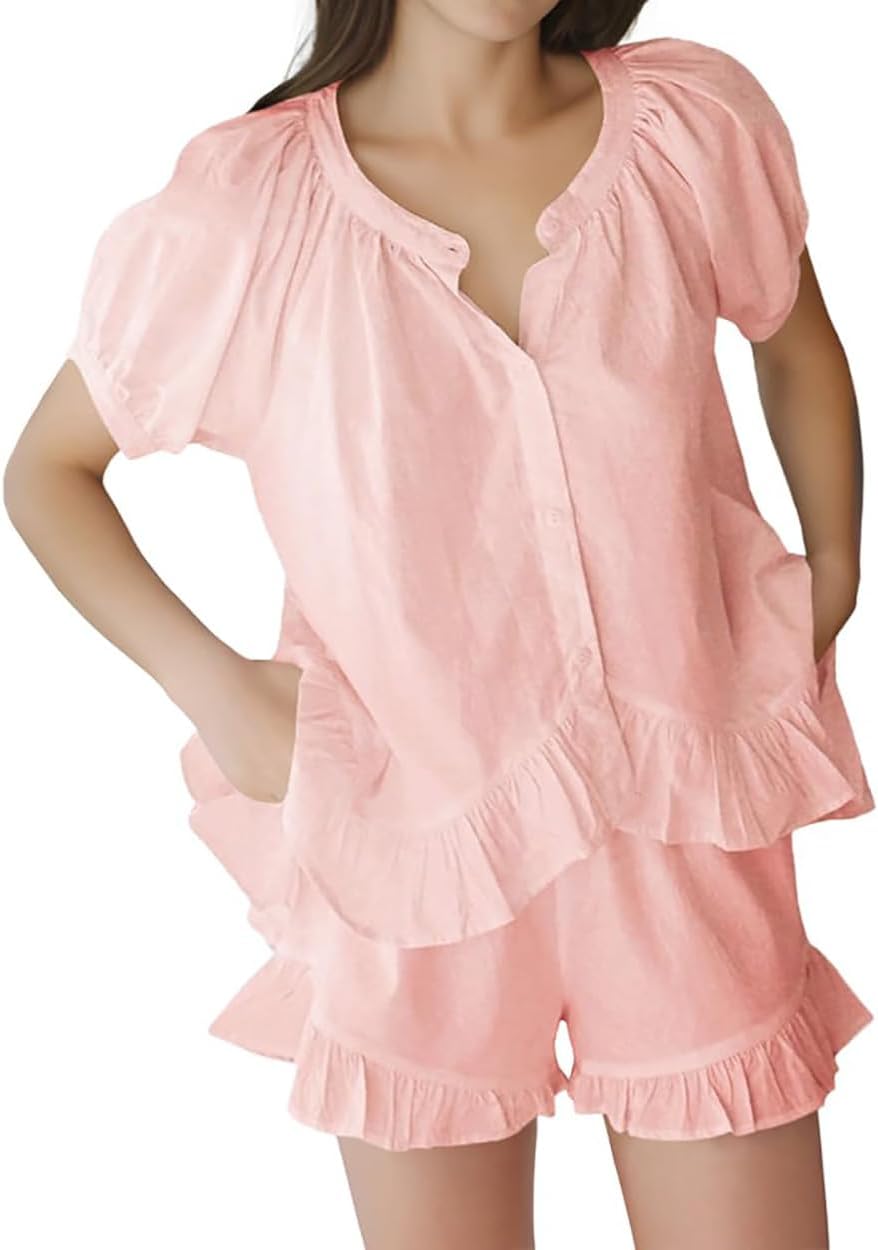 Womens Fashion Summer Short Sets Short Sleeve Button Down Ruffle Trim Top and Shorts Cotton Pajama Sets