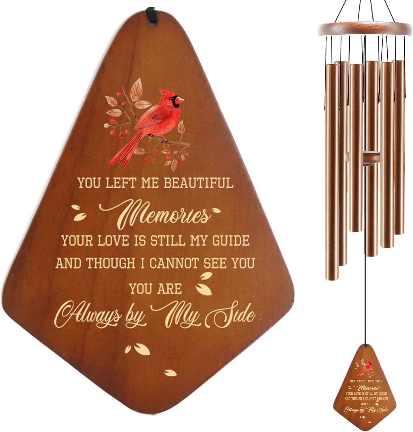 - Sympathy Gift for loss of loved one:The uniquely designed, red bird wind chime gives a sense of hope and is printed with the words"You left me beautiful memories, your love is still my guide and though I cannot see you, you are always by my side" Cardinal symbolize good luck in many cultures. It provides peace and hope to grieving friends or family members who have lost loved ones. When they receive this remembrance wind chimes for outside, they will feel your deep blessing.So if you're looking for a special sympathy gift, this bell is perfect.