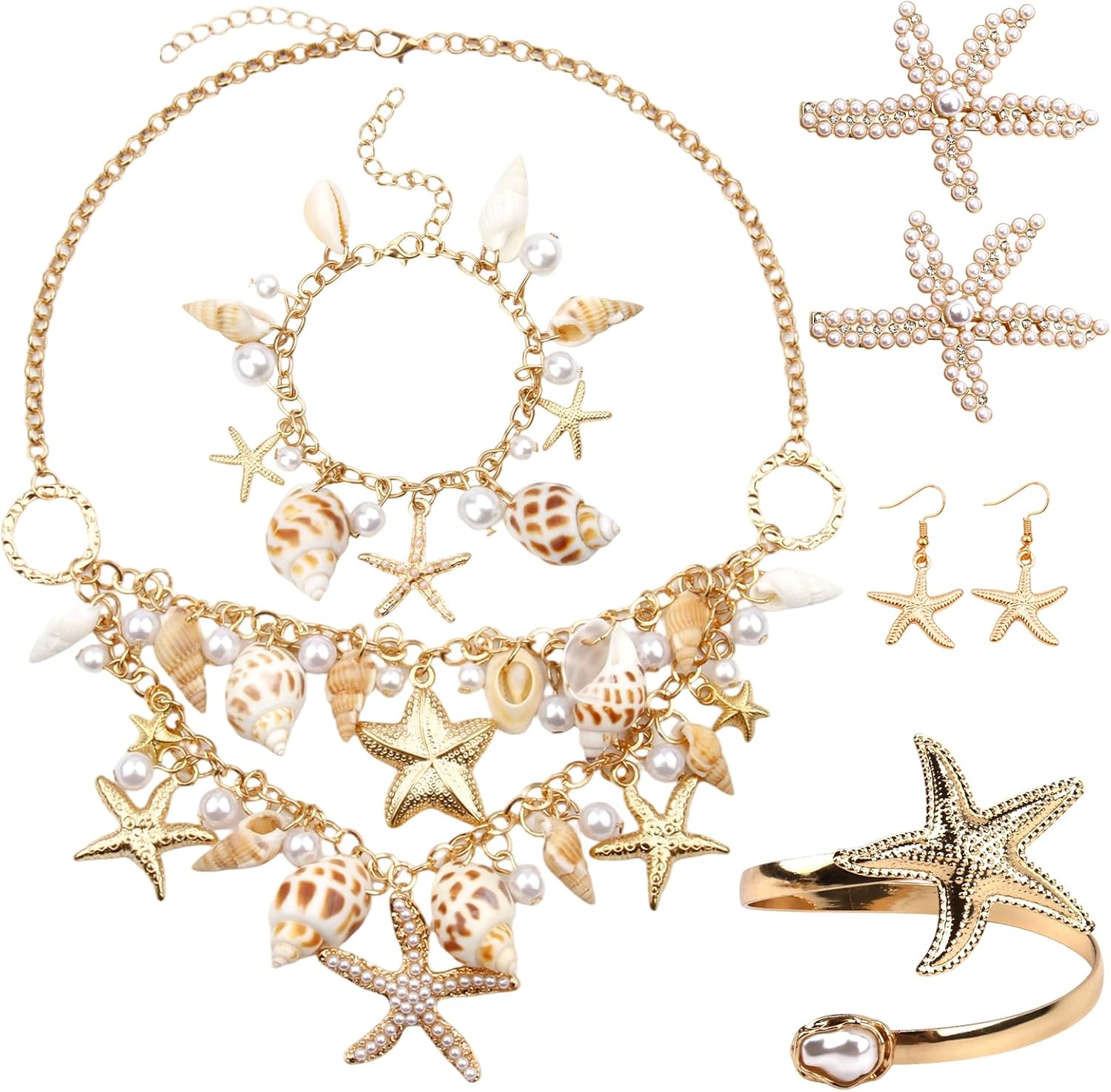 Starfish Seashell Necklace Bracelet Dainty Boho Jewelry Set Gold Beach Jewelry Accessories for Women Summer Vacation Coastal Beachy