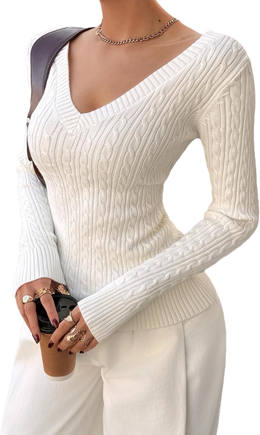 Womens Long Sleeve Cable Knit Sweater 2025 Fall Fashion V Neck Fitted Pullover Top Business Casual Work Fall Outfits