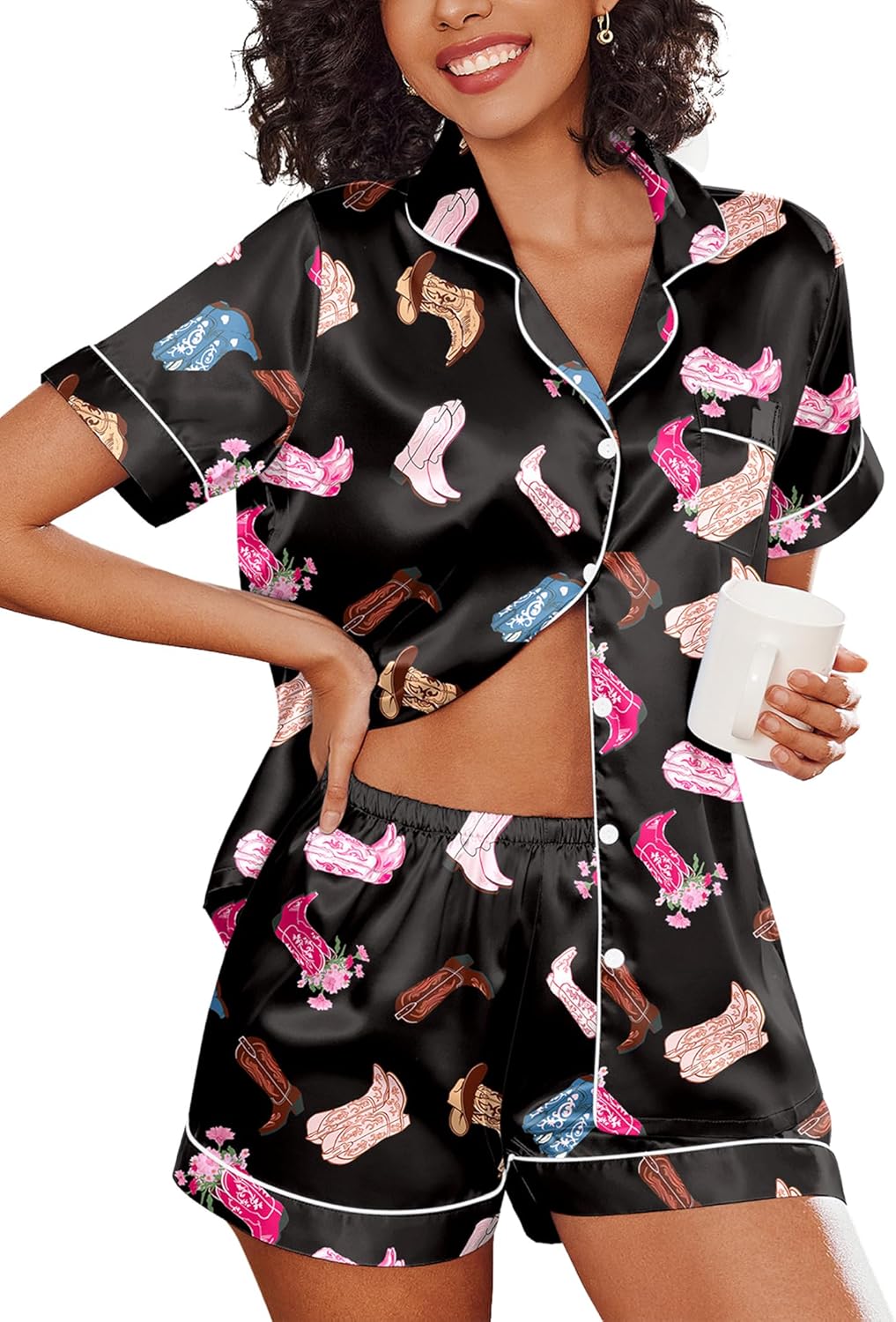 Ekouaer Women's Silk Satin Pajama Set Short Sleeve Pjs Shorts Set Comfy Button Down 2 Piece Sleepwear Loungewear