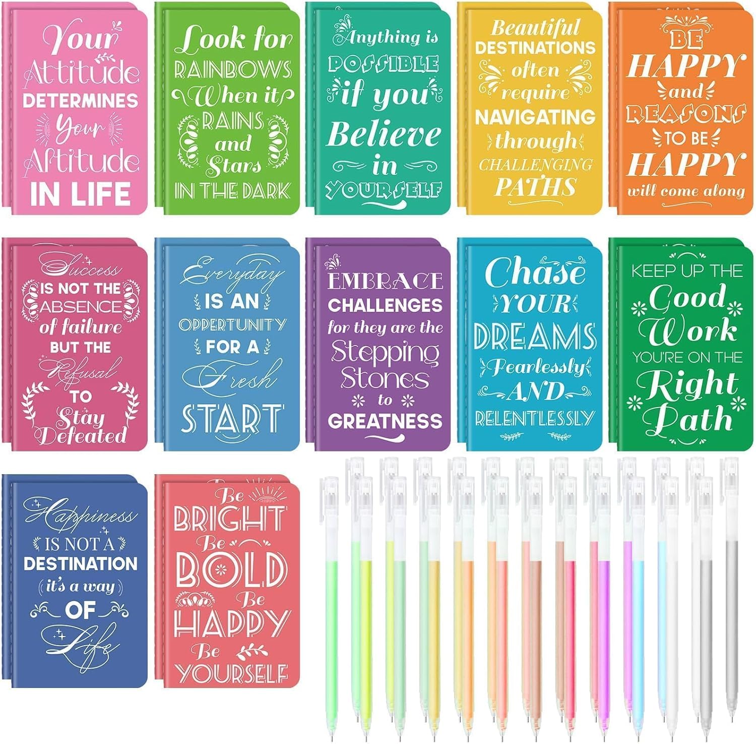- 【Value for Money】Our notebook set includes 48 inspirational gifts—24 colorful gel pens in 12 colors and 24 inspirational mini journal bulk in 12 different styles. What sets us apart? You'll receive double the quantity at a comparable price. With ample quantity and diverse styles, these items cater to both your daily needs and sharing desires.