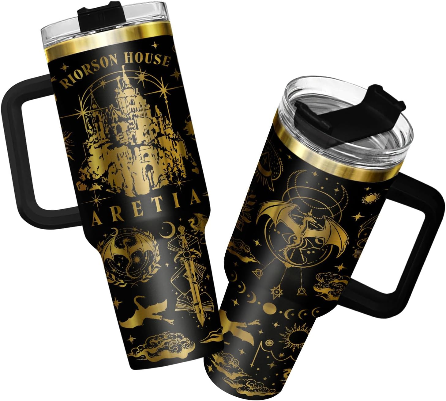 34HD Fantasy Castle Dragon Tumbler 40oz Stainless Steel Insulated with Handle Straw - Engraved Magical Book Lover Gift, Birthday Bookworm Present to Women & Young Adults - Bookish Items