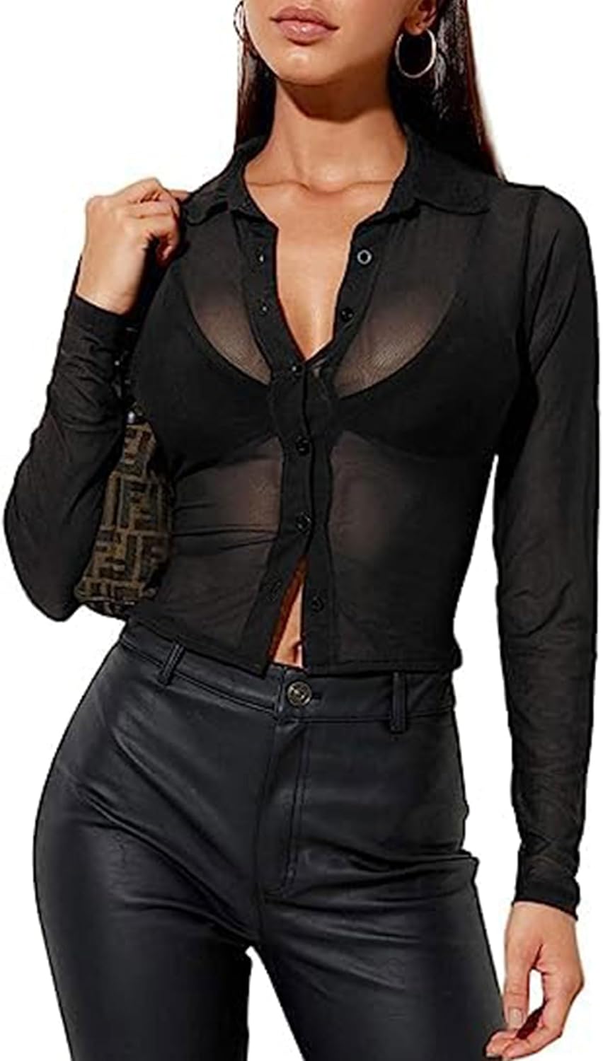 Remidoo Women's Sexy Sheer Mesh Button Down Long Sleeve Crop Top Blouse Shirt