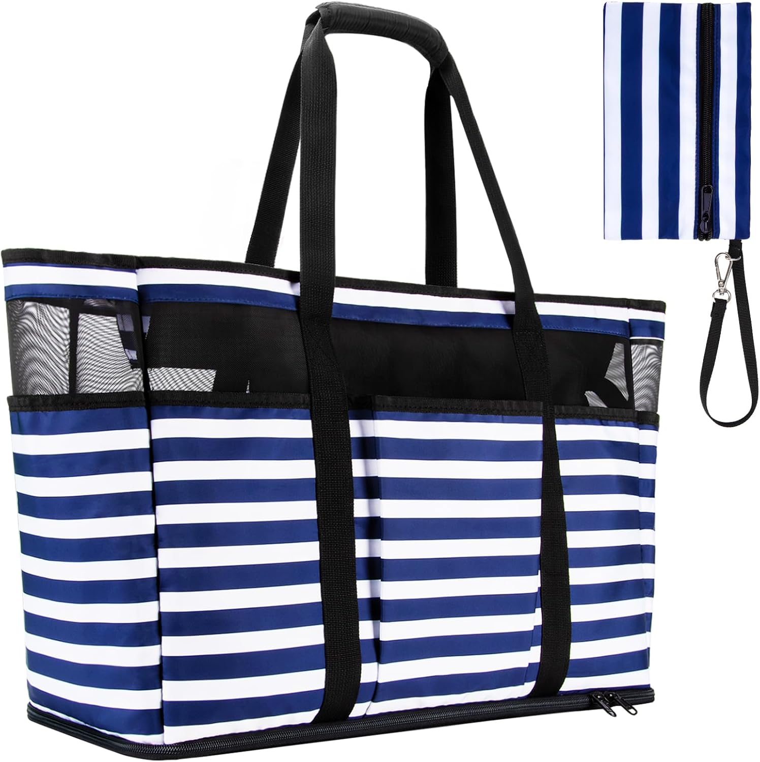 Large Beach Bag with Zipper, 12 Pockets Waterproof Sandproof Pool Bag Womens Mesh Beach Tote Bag for Travel Vacation