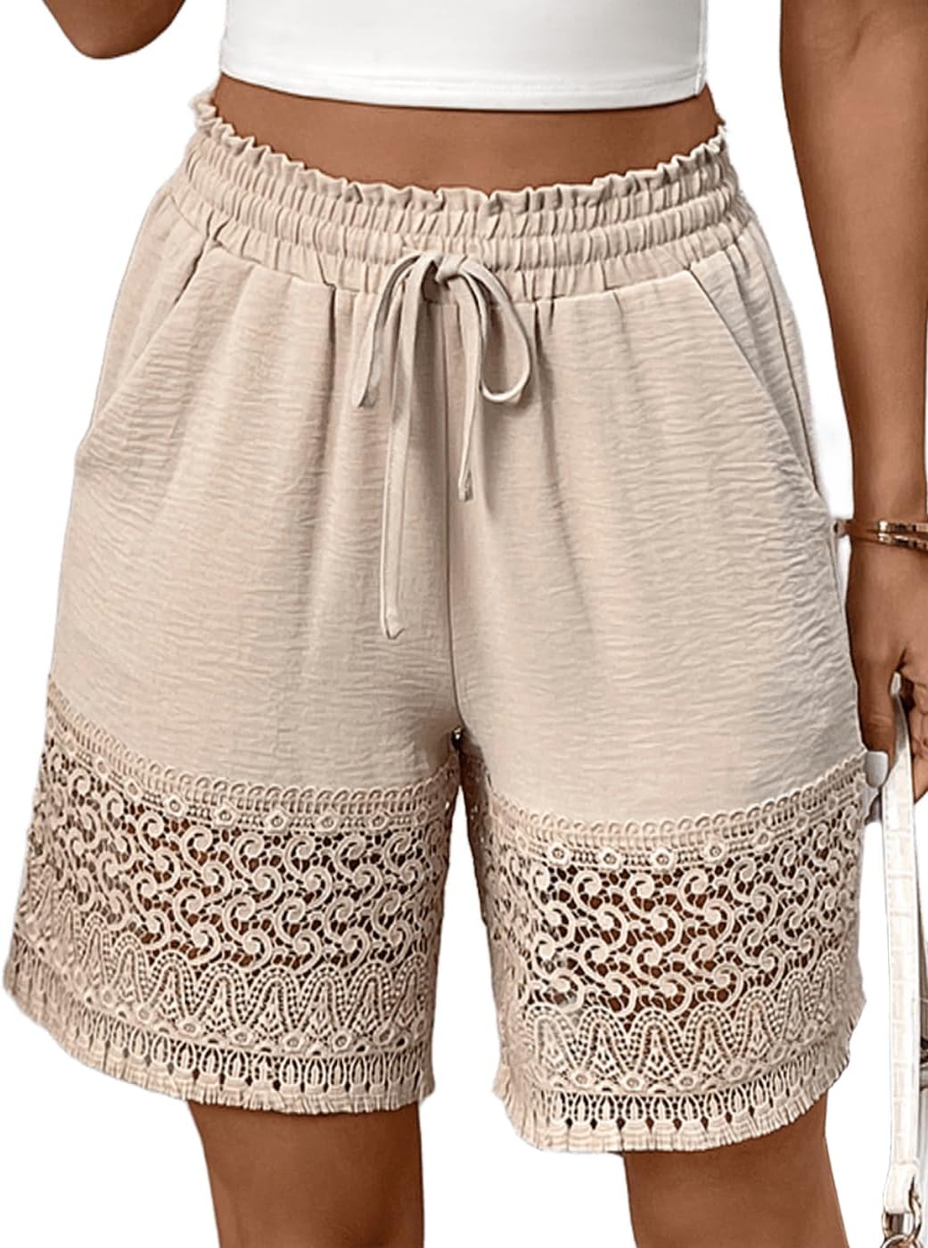 CORSKI Women's Casual Elastic Waist Lounge Shorts Lace Trim Drawstring Summer Beach Shorts with Pockets