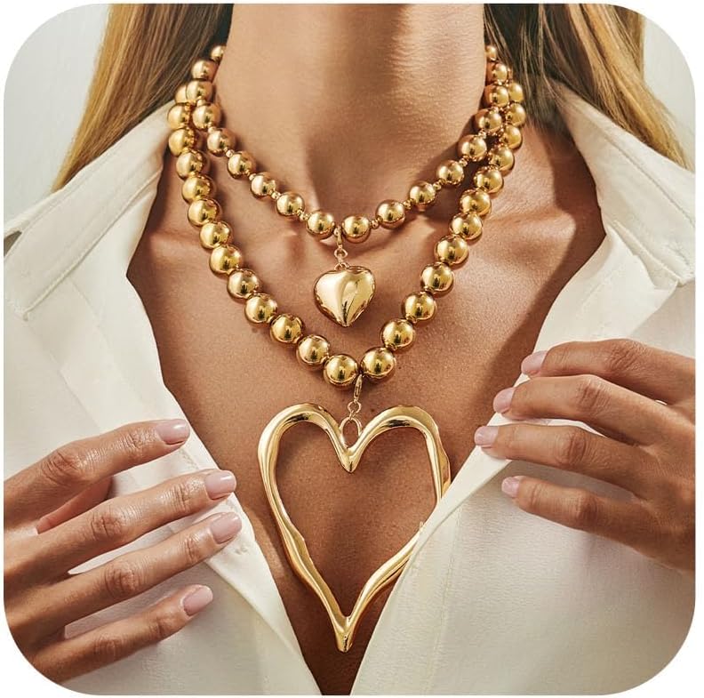 Chunky Heart Necklace Silver Statement Necklace Puffy Heart Pendant Valentines Necklace Accessories for Women Valentines Day Gifts Galentines Gifts Summer Beach Jewelry